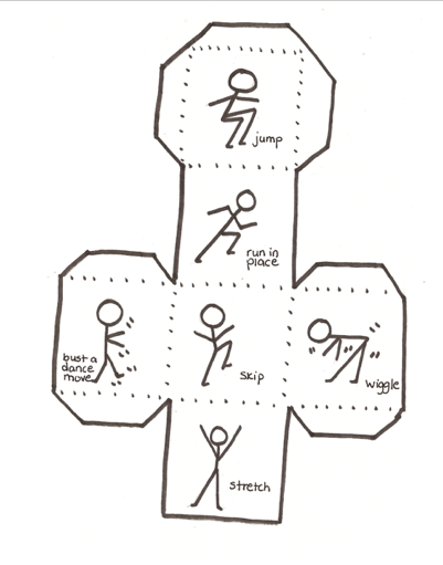 Make Music Cubes. On one write the name of six familiar songs. On the other write six actions (IE jump and turn, stomp your foot, clap your hands). Let the children take turns rolling the dice and then as a class do the actions to the song that was rolled.