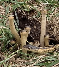 Do animal riddles with the children. I’m thinking of an animal that has… (spots all over its body and a very long neck and legs. It eats leaves from the tops of the trees)
