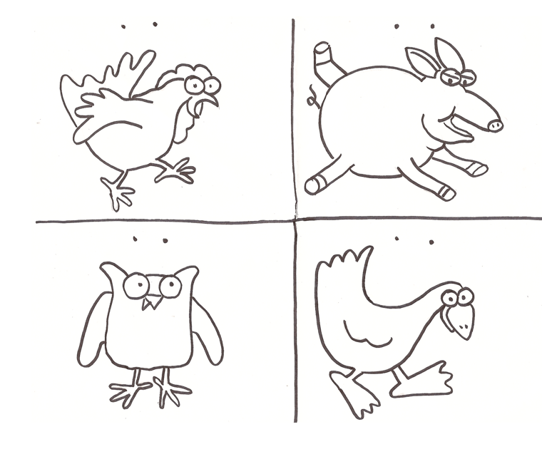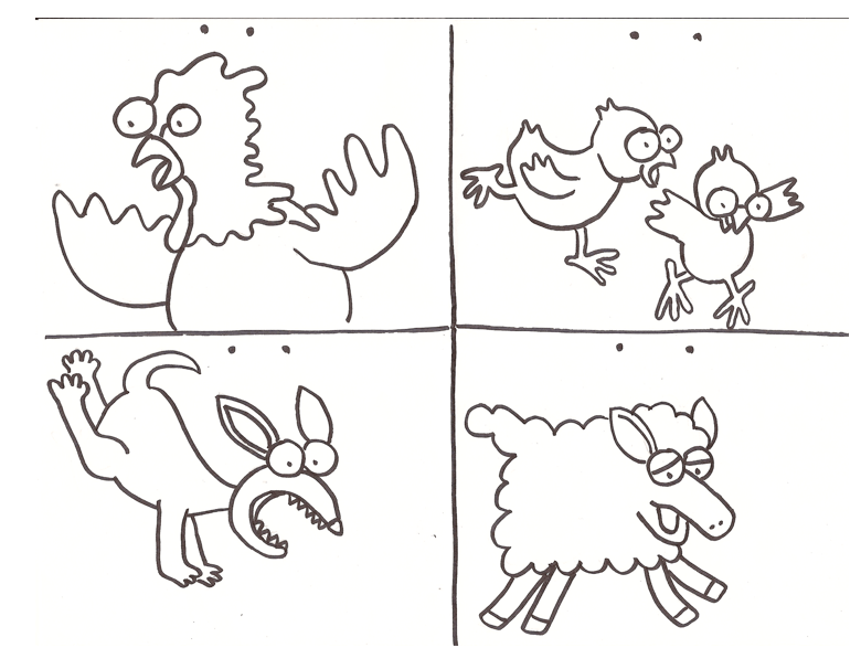 Using the picture cards of the animals in the story; play, One of these is not like the other. https://www.youtube.com/watch?v=rsRjQDrDnY8 Put out 3 cards where the children can see them making 1 different from the other. (2 birds & 1 not bird, cat-cow&pig, 2chicks-cards with only 1 animal, 2 w/4footed&1 w/2feet).