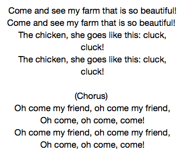 Teach the children the song, Come and See My Farm. Teach it in Spanish if possible. https://www.youtube.com/watch?v=rJzpFDA2rCw