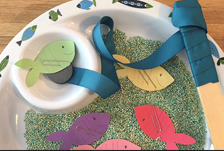 Remind the children that Fishermen sometimes work all night trying to catch fish for people to eat. Turn your dramatic center into a fishing boat by bringing in 4-6 chairs and facing them all together touching. Make fishing poles out of rulers with pieces of yarn tied at one end. At the other end, tie a magnet. Make fish and label each fish with a concept that you are learning (letters, numbers, colors). Add several large paperclips to each fish. The children can pretend to be fishing as they try to tap a magnet onto a paper clipped fish.