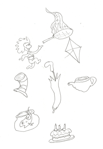 Make copy of the Cat in the Hat items and cut around each. Make a loop of masking tape to attach each to a board or wall where all the children can see. Cover the board and take away one object. Turn it back for the children to see and tell which object is missing.