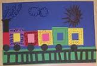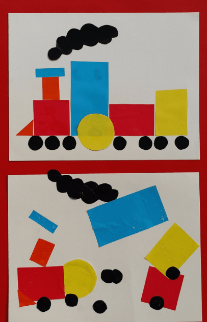 Cut out many shapes in small, medium, and large. Let the children collage the shapes to make train cars.