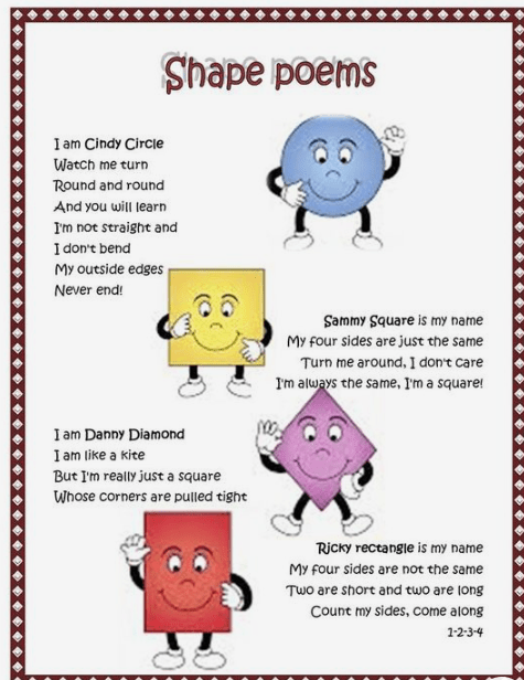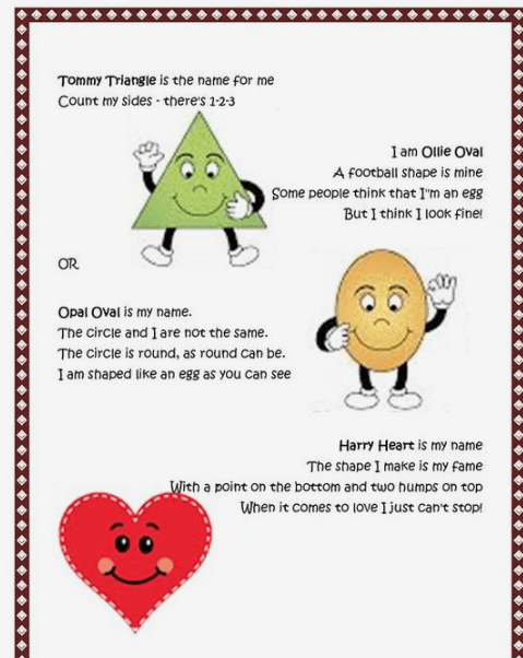 Go through the book and see if there are any shapes that the children in the room may not know. Introduce these shapes by drawing the on a whiteboard and talking about their attributes. Have the children draw the shapes in the air. (A circle has no corners, it just goes around and around and around. An oval is like a circle because it has no corners but it goes long and around and long and around).