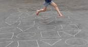 Play Jump Across the River. On the cement draw a variety of shapes large enough for a child to jump on. Make the shapes close enough for children to be able to jump onto several shapes from one spot. Have the children take turns trying to jump from one side of the river to the other by jumping on the shapes that you call out (jump onto the circle, jump onto a square, jump back onto the circle, jump onto a rectangle, etc).