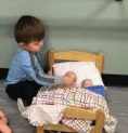 The most basic dramatic play situation is ‘home’. This allows even the youngest children to bring their experiences into the center play. But it is NOT the only dramatic play scenario that you can set up in your classroom. By bringing in simple materials you can provide a variety of meaningful play experiences. It is through dramatic play that children learn to assign roles and act them out. This helps them to deepen their understanding of how the world works (who is going to drive the bus, call 911, be the fireperson/s?). By bringing in materials children learn naturally how to problem-solve and share (How can we keep this sheet from falling down? What can we use to hold all the animals?).