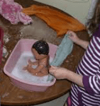 Watch your children as they involve themselves in dramatic play. You can learn a lot about how they understand the workings of the world: (Money concepts, food groups, community experiences, home life experiences). As they role-play home and community experiences they bounce vocabulary words back and forth and ask questions to each other extending and fortifying the play. Dramatic play does not require lots of fancy equipment however it is best to use real objects whenever possible. Younger children may not have the abstract thinking skills needed to use pine needles for spaghetti and pinecones for meatballs. This is where a teacher can move in and help begin the play.