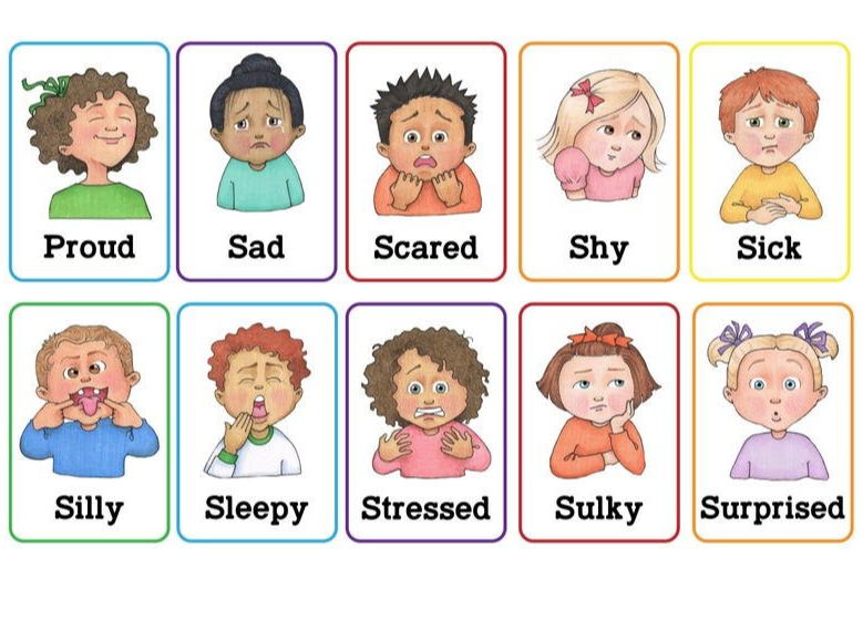 Afraid, Affection, Annoyed, Awful, Bored, Brave, Calm, Capable, Caring, Cheerful, Clumsy, Confused, Comfortable, Confident, Cooperative, Creative, Cruel, Curious, Depressed, Disappointed, Disgusted, Ecstatic, Embarrassed, Enjoying, Excited, Exhausted, Fantastic, Fearful, Fed-up, Free, Friendly, Frightened, Gentle, Generous, Gloomy, Guilty, Ignored, Impatient, Important, Interested, Jealous, Joyful, Lonely, Lost, Loving, Overwhelmed, Peaceful, Pleasant, Proud, Relaxed, Relieved, Safe, Satisfied, Shy, Silly, Strong, Stubborn, Suspicious, Tense, Thoughtful, Thrilled, Troubled, Unafraid, Uncomfortable, Weary, Worried