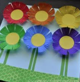 Give each child a paper plate and show them how to glue the triangle pedals onto it. When they have dried you can cut out stems and leaves or let the children cut out stems and leaves. These make a cute wall display. As the children are gluing the triangles on, ask them about the colors that they are using. If by chance you have foam squares, the colors are much more vibrant.