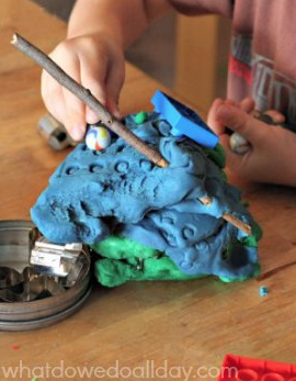 - Add small birds, silk flowers, rocks, and pipe cleaners to the play dough so the children can make up stories as they play.