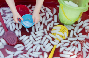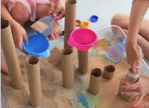 The water and sand table teaches children the ability to problem-solve when they are trying to make water go through tubing or get a toy fish out of the mustard bottle. By providing various containers and scoopers you are inviting the children to explore math concepts such as size, volume, and quantity.